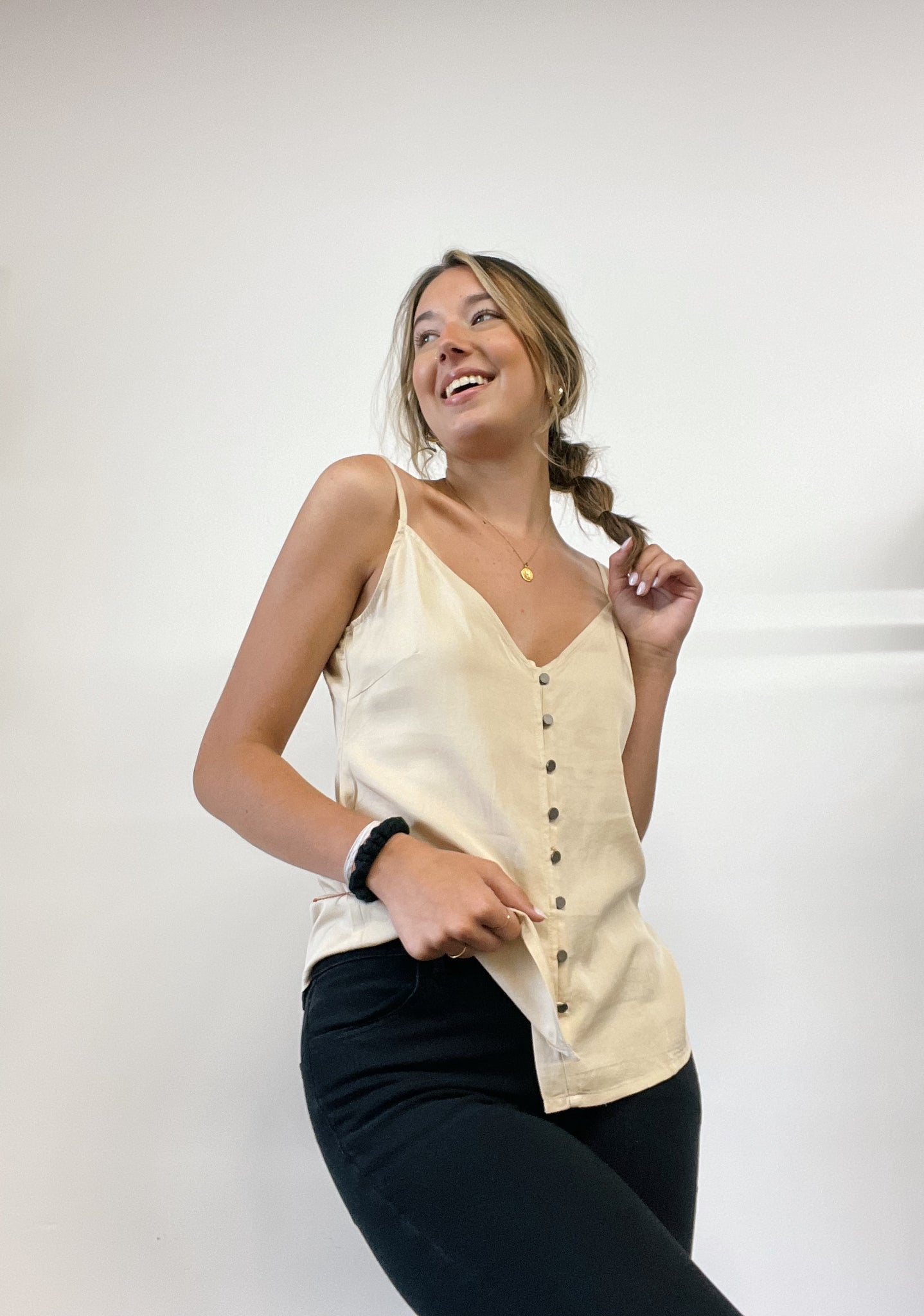 THE NEW PERFECT CAMI! TAN/BEIGE COLOR WITH GUNMETAL BUTTONS ALL THE WAY DOWN THE FRONT. ADJUSTABLE STRAPS TO FIT YOUR NEEDS.
