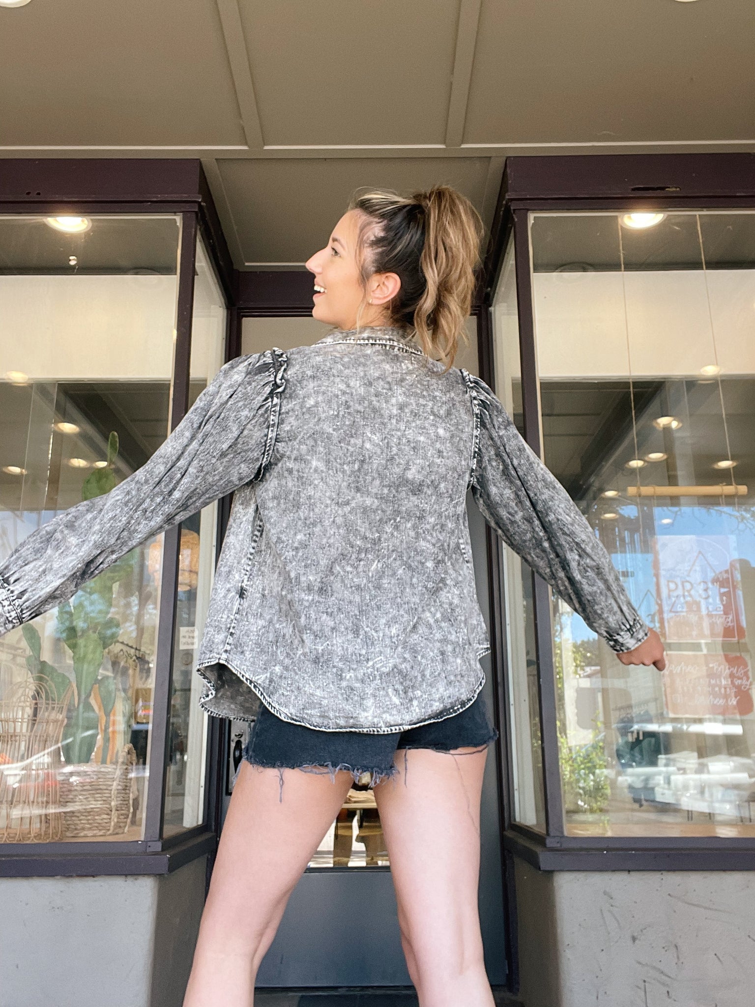 LONG SLEEVE, YET LIGHTWEIGHT ACID WASH DENIM BUTTON UP. CUTEST RUFFLED DETAIL ON THE SHOULDER SEAMS, COLLAR, SILVER BUTTONS.