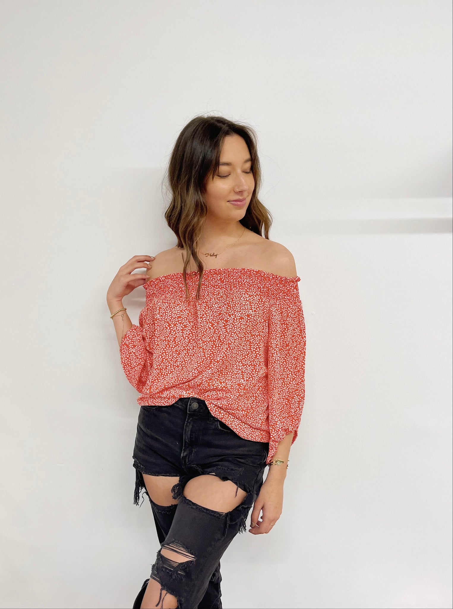 Bright red floral 3/4 sleeve blouse with a cinched neckline to wear off your shoulders