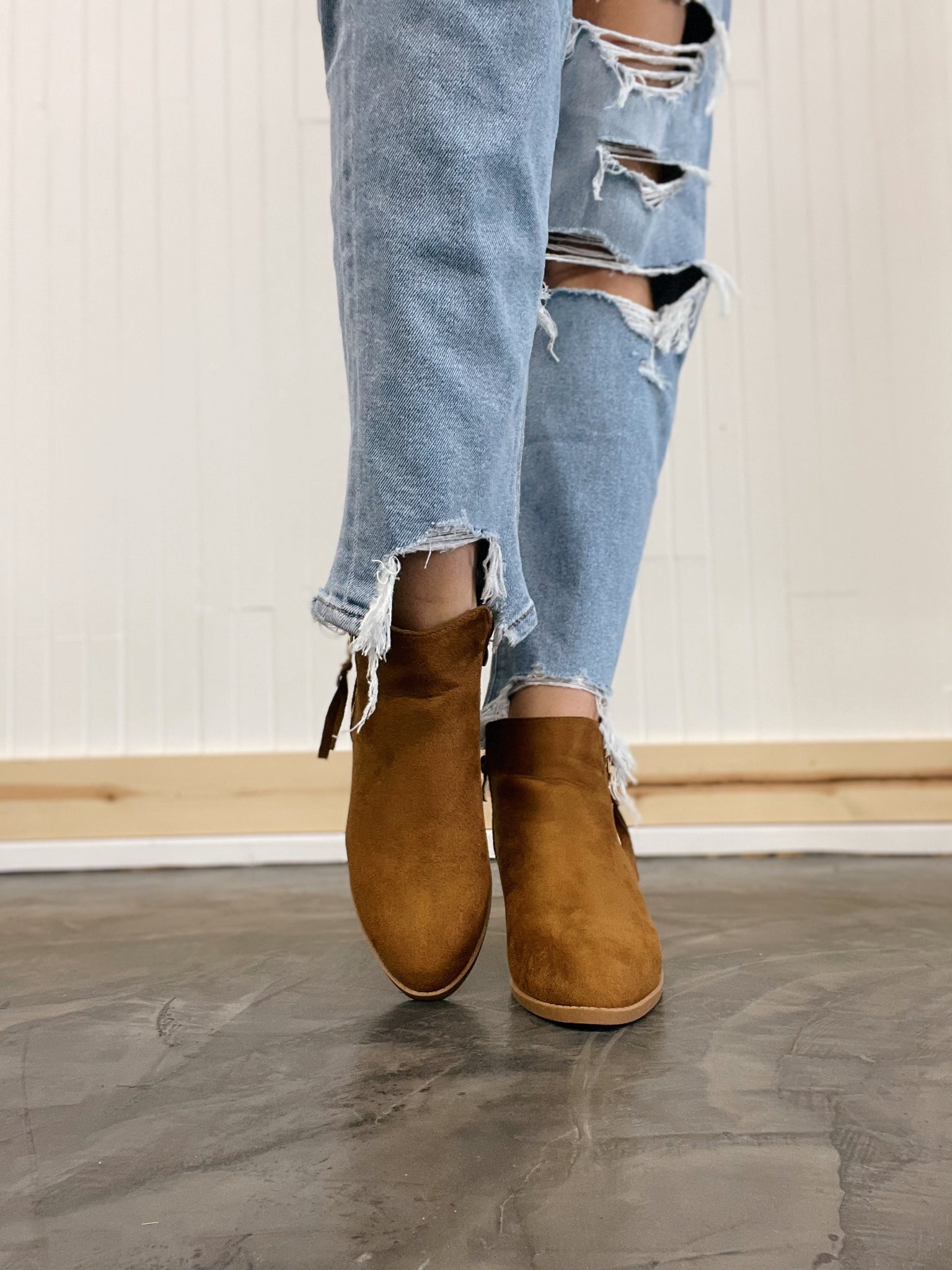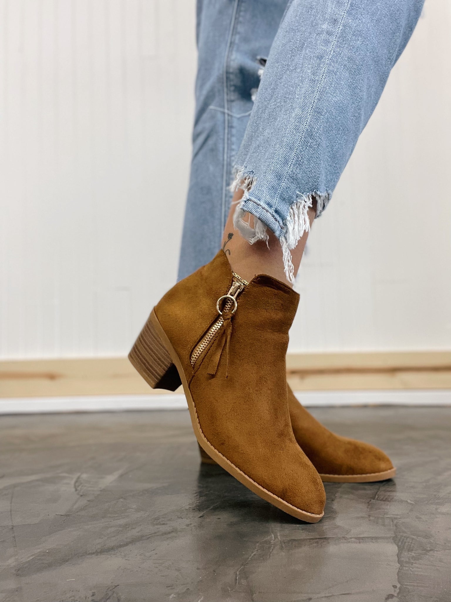 TAN SUEDE ANKLE BOOTIE WITH A GOLD DETAIL ZIPPER
