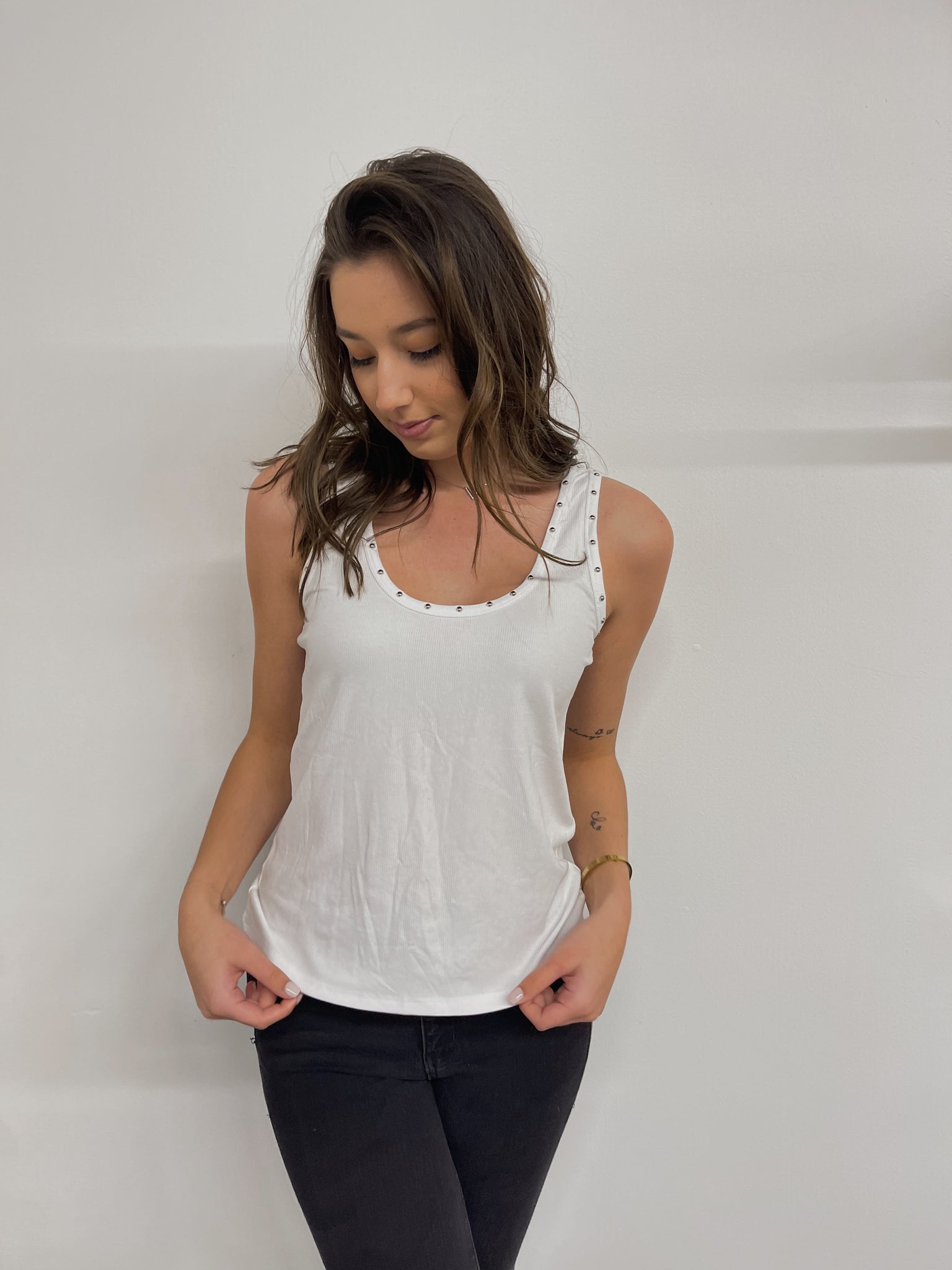 THIS WHITE TANK HAS THE COOLEST DETAIL YET SIMPLE. SILVER STUDS OUTLINE THE STRAPS, FRONT AND BACK NECKLINE FOR A DIFFERENT KIND OF DETAIL. PAIR WITH JEANS FOR A SIMPLE LOOK OR DRESS IT UP IN ANY WAY!